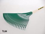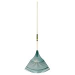 Large plastic rake with a lightweight 48″ wooden handle.